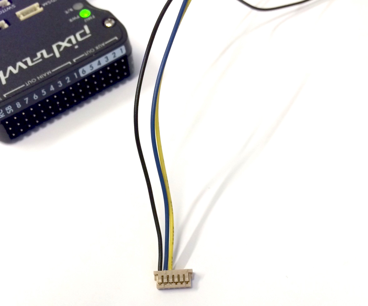 Connect the 6-pos DF13 1:1 cable on the Dronecode probe to the SERIAL4/5 port of Pixhawk.